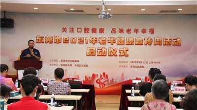 健康是重要的民生问题。随着社会老龄化进程的加快,老年健康问题越来越突出。受东莞市卫生健康局保健局局长余锐标委托,东莞市卫生健康局老龄健康科科长赖建军发表致辞:我市户籍老年人口达到35.4万人,希望通过老年健康宣传周的一系列公益活动,能够为老年人提供健康教育、健康体检、心理关爱等口腔健康管理服务,引导老年人养成良好的健康习惯,改善老年人口腔健康状况,提高老年人生活质量、健康素养和水平。并将以这次活动为契机,进一步加强养老领域改革,加大推动老年口腔健康事业发展。