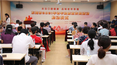 今年7月12日到7月18日是全国第三个老年健康宣传周,东莞市2021年健康宣传周活动启动仪式在东莞口腔医院3A会议室举行,今年的主题是“关注口腔健康,品味老年幸福”。 东莞市卫生健康局老龄健康科科长赖建军,南城街道卫生健康局副局长张凤玲,东莞广播电视台新媒体中心主任陈伟全,东莞口腔医院院长袁东辉,东莞口腔医院荣誉院长王立超出席了仪式。现场有30余名老年人参加,活动通过专家科普讲座,帮助老年人掌握口腔保健知识,切实提高老健康素养水平和健康水平。