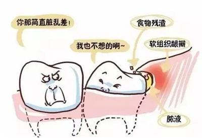 智齿没有足够的空间萌出,牙冠仅部分萌出或牙的位置偏斜,牙体与牙龈之间形成盲袋,食物和细菌堆积,当身体抵抗力下降时,易引起智齿冠周炎。