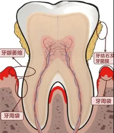 此外,还有牙周袋形成,在正常情况下,健康牙龈的龈沟深度不超过2mm,超过两毫米则为牙周袋。