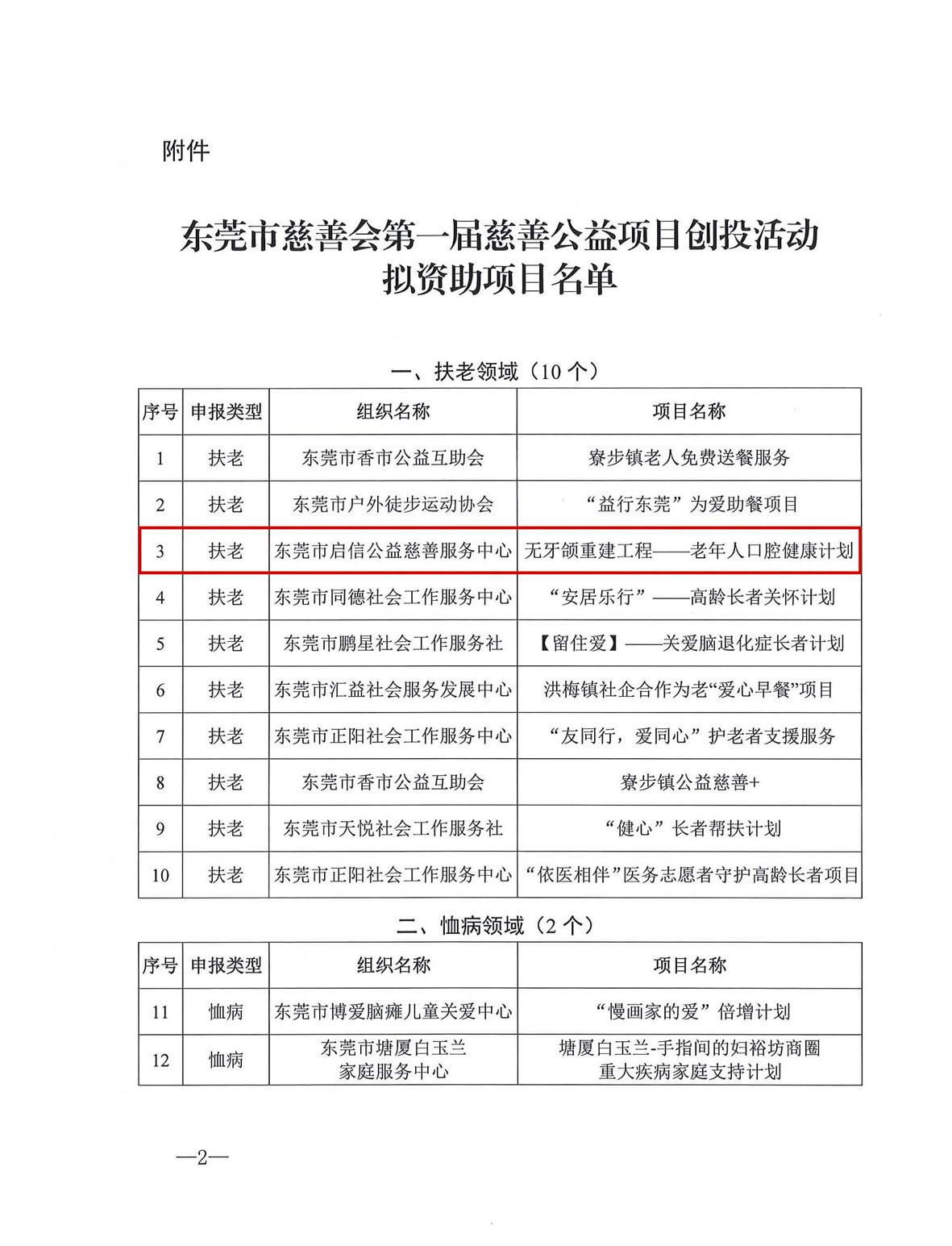 为实施世界卫生组织“8020”(80岁拥有20颗可使用的牙齿)的健康标准,进一步响应国家关于提高基层地区医疗服务水平的号召, 贯彻落实党的十九大精神,东莞市启信公益慈善服务中心、东莞口腔医院联合启动了东莞市首届创投“ 无牙颌重建工程·老年人口腔健康计划”公益项目,向全市征集缺失牙案例,为其提供专业的治疗服务援助,以提高老人晚年生活质量, 并带动更多的企事业机构和爱心人士投身到关爱老年人口腔健康的行列当中,为共筑中国梦、健康梦而贡献自己的一份力量。